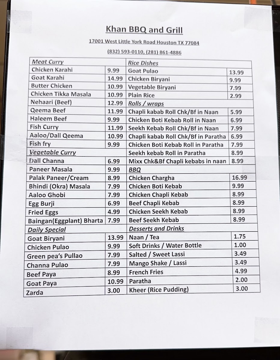 Welcome to Khan BBQ & Grill, a culinary gem located at 17001 W Little York Rd, Houston, TX. This restaurant offers a vibrant menu that beautifully encapsulates authentic flavor profiles, ideal for anyone craving traditional South Asian cuisine.